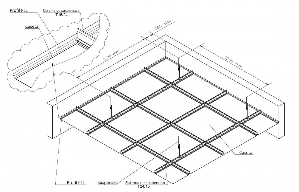 Tavanele casetate sunt compuse dintr-un sistem de suporturi (tije) fixate de tavan. La rândul lor, de tije sunt fixate ghidajele (longitudinale și transversale), care formează celulele carcasei de susținere și asigură rigiditatea întregii construcții. Casetele decorative din aluminiu se instalează în celulele carcasei.