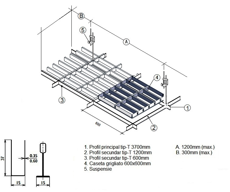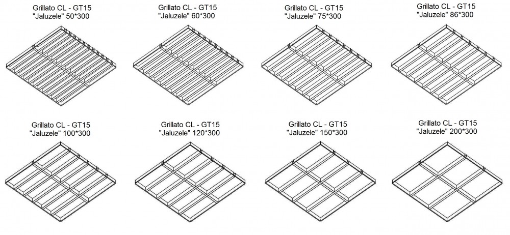 Sistemul de tavan raster CL-G T15 Jaluzele este format din grile în volum separate, formate din intersectarea profilurilor vopsite "mamă" și "tata". De-a lungul perimetrului, grila este încadrată de profiluri în formă de L. Fiecare grilaj separat poate fi ușor așezat în formele sistemului de suspendare „T-profil“ cu lățimea de 15 mm. La finalizarea instalării grilajelor pe sistemul de suspendare, suprafață dă impresia unei structuri monolit, care creează iluzia unui tavan Grillato clasic.