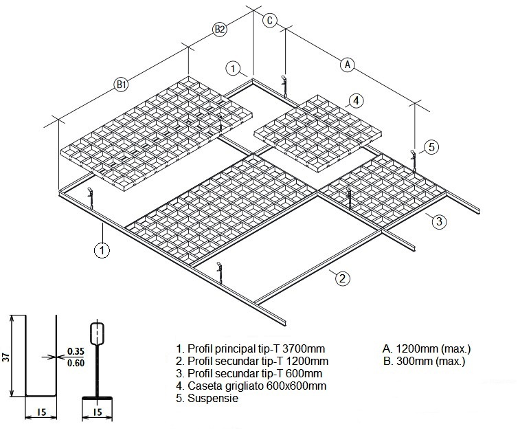 Sistemul de tavane de Design Grillato CL-T15 este format din grilaje în volum separate, elementele diagonale și sistemul de suspendare „profil -T“ cu lățimea de 15 mm. Grilajele în volum sunt formate de intersectarea profilelor în formă de U și elementele diagonale. De-a lungul perimetrului, grila este încadrată de profile în formă de L. Fiecare grilaj separat poate fi ușor așezat în celula standard a sistemului de suspendare T-15. La finalizarea instalării grilajelor pe sistemul de suspendare este dificil de a face vizual diferența dintre T-profilurile sistemului de suspendare și U-Profilurile sistemului Grillato, adică suprafața crează impresia unei structuri integre (continue).