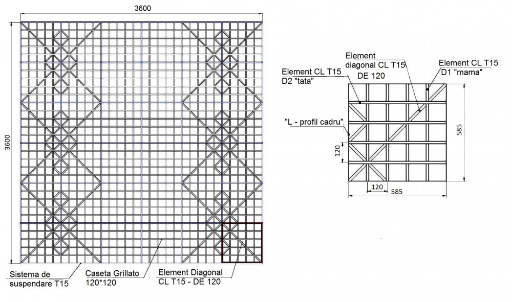 Tavanele de designer Grillato CL-T15 sunt create pe baza tavanelor Grillato CL-T15 cu adaosul elementului diagonal, ce permite crearea direritor desene pe tavan.