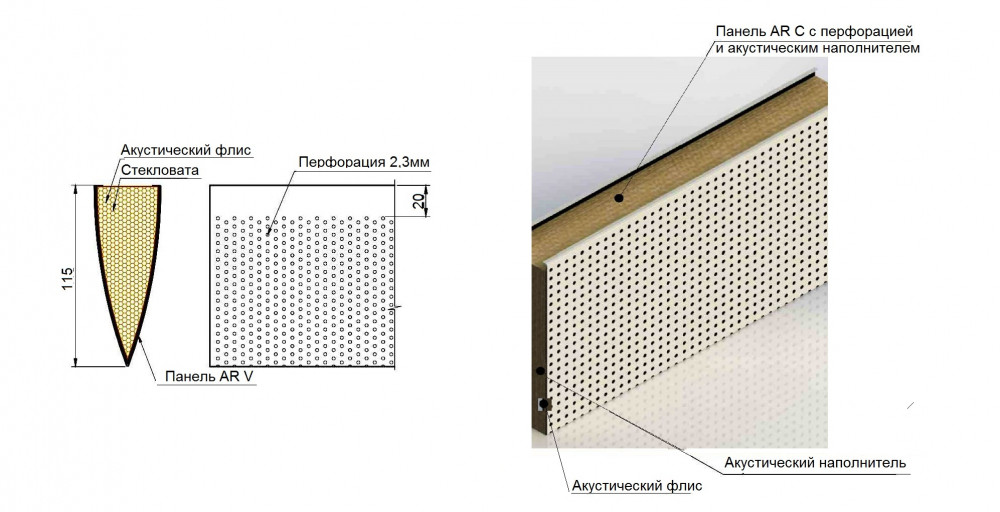 Для того чтобы обеспечить оптимальный акустический контроль в помещениях, рейки могут быть перфорированными. . В качестве стандартной функции, перфорированные панели снабжены звукопоглощающим нетканым материалом наклеенным на внутренней поверхности панели и заполнены минераловатой.