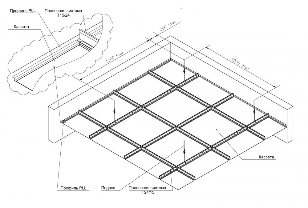 Кассетные потолки состоят из системы кронштейнов (подвесов), прикрепленных к перекрытию. В свою очередь, к подвесам крепятся направляющие (продольные и поперечные), образующие ячейки несущего каркаса и обеспечивающие жесткость всей конструкции. Декоративные алюминиевые кассеты устанавливаются в ячейках каркаса.